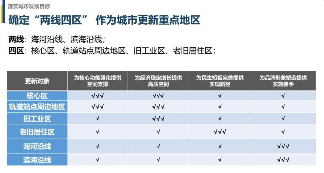 为城市品牌形象提升提供实施抓手。积极推进海河沿线地区的城市更新;提前谋划滨海地区的城市更新。