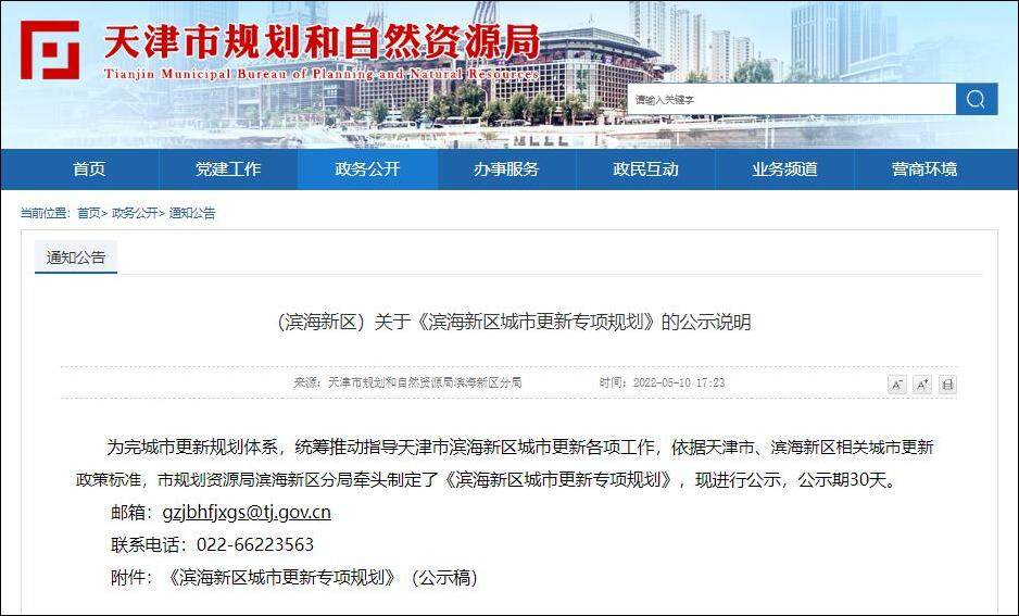 2022年5月10日,天津市规划和自然资源局滨海新区分局发布关于《滨海新区城市更新专项规划》的公示说明。