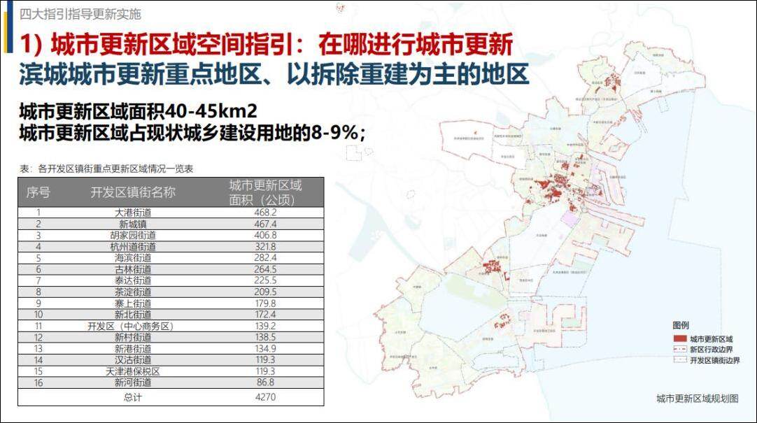 1.城市更新区域。重点落实城市更新战略,规划到2035年,滨海新区城市更新区域规模为40-45平方公里,主要涉及大港街道、新城镇、胡家园街道、杭州街道、海滨街道、古林街道、泰达街道、茶淀街道、寨上街道、新北街道、开发区(中心商务区)、新村街道、新港街道、汉沽街道和天津港保税区等镇街的部分地区。