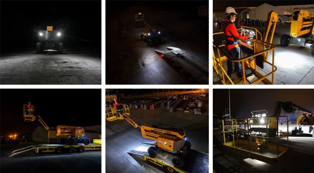 然而!在可视范围变小、能见度降低的夜间却处处存在着安全隐患,随时可能威胁人员安全。夜间装卸时,如果操作员视线受限会有设备倾覆的危险。夜间行驶时,如果设备缺少照明警示,容易成为施害者,造成人员伤亡。夜间作业时,如果缺乏强照明灯光,不仅影响工作效率,还容易出现事故。值得一提的是,很多城市不允许白天运行运输板车,导致很多设备只能夜间入场,使得设备运输时的照明条件尤其重要。