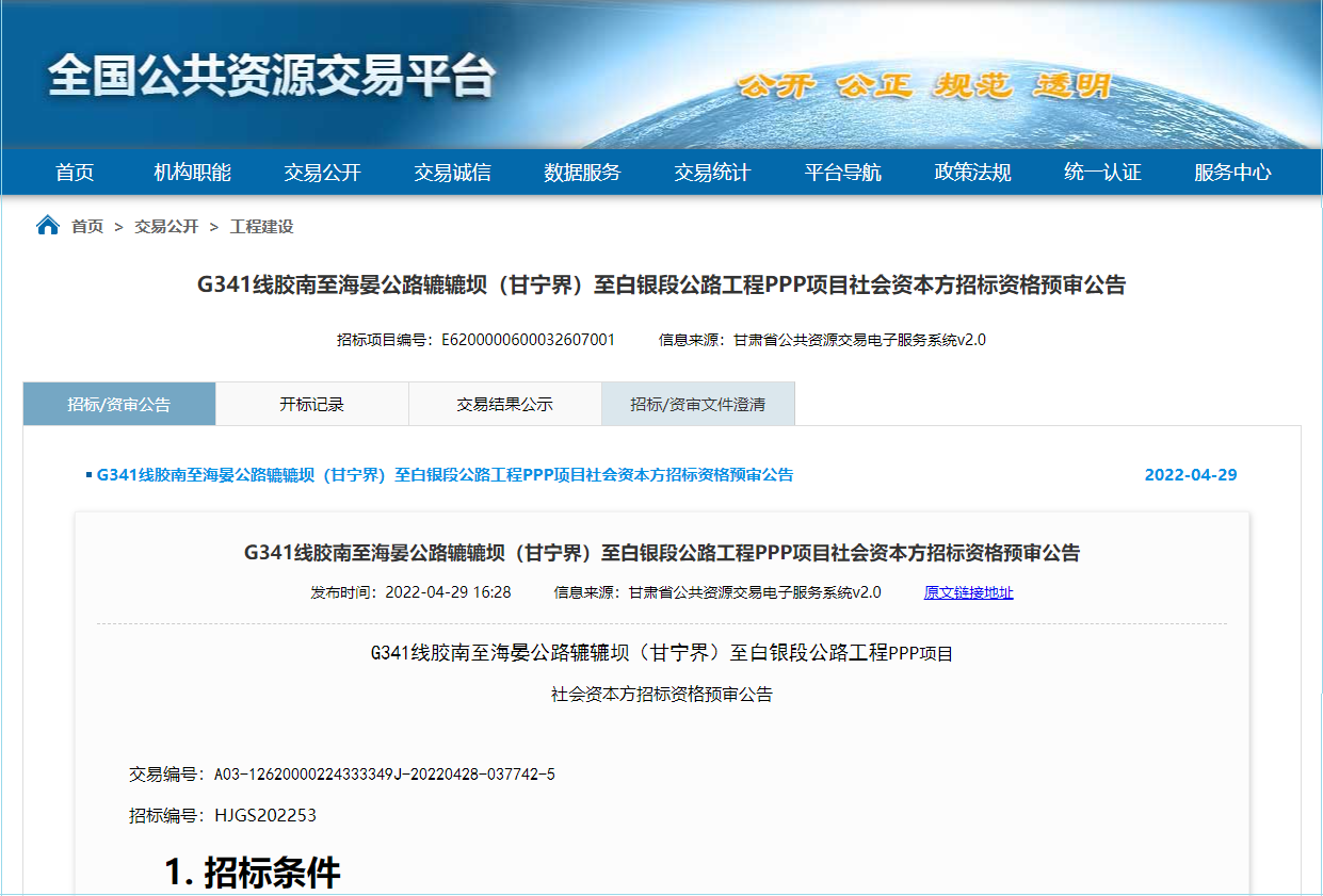 好消息,G341线胶南至海晏公路辘辘坝至白银段即将开建啦,从全国公共资源交易中心网站了解到该项目已经开始招标,工程投资为 1119686.71 万元。