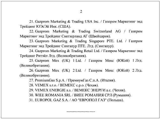 该名单列出了31家公司该制裁名单包括来自德国、英国、法国、奥地利、瑞士、比利时、意大利、捷克、斯洛伐克、保加利亚、罗马尼亚、波兰等欧洲国家,以及美国和新加坡的31家供应和销售俄罗斯天然气的公司。其中大部分是与德国Gazprom Germania和Gazprom Marketing & Trading Ltd.有关的俄气前子公司,以及地下天然气储存设施的贸易商和运营商。此外波兰与俄气的合资企业EuRoPol GAZ SA也受到制裁影响,该公司是亚马尔-欧洲天然气管道波兰段的所有者。