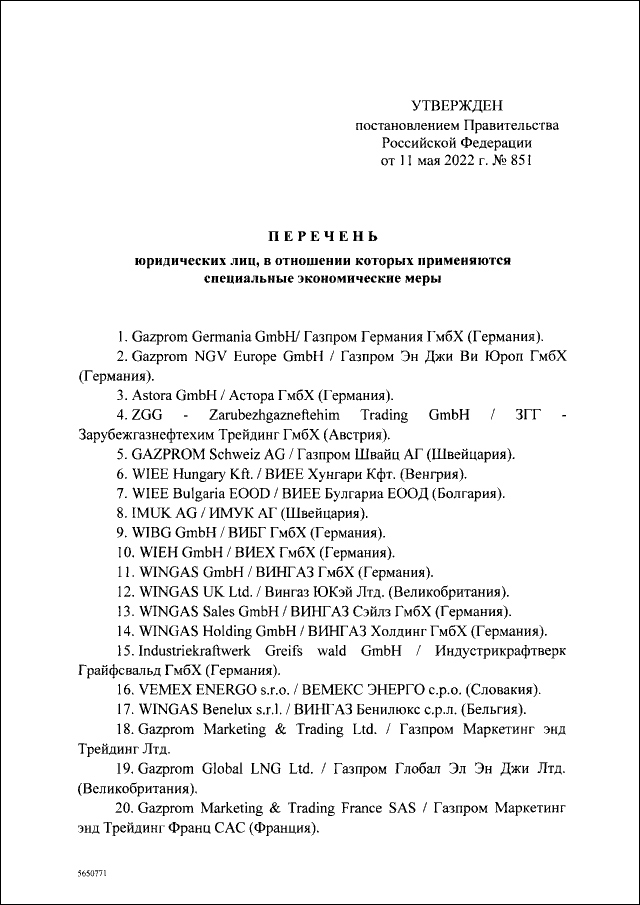 2022年5月12日,俄罗斯一项政府法令称,在西方对俄罗斯入侵乌克兰实施惩罚后,莫斯科已对30多家欧盟、美国和新加坡的能源公司实施制裁。作为报复性举措。