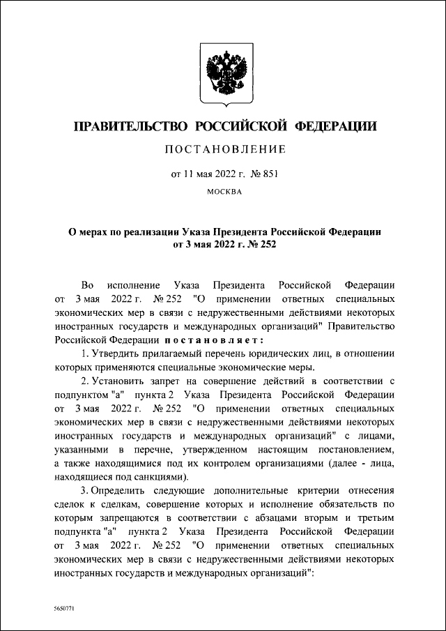 俄总统普京签署总统令,以经济措施回应外国的不友好行为。总统令要求,联邦政府在5月13日前确定被制裁组织和个人的清单。对于被列入制裁清单的实体,法令禁止俄政府机构、法人实体及公民与其签订包括对外贸易在内的任何协议,履行已缔结交易中对其的义务,或进行有利于这些实体的金融交易,被制裁实体的船只也被禁止进入俄罗斯港口。但俄财政部有权对受制裁实体的某些业务给予临时许可。