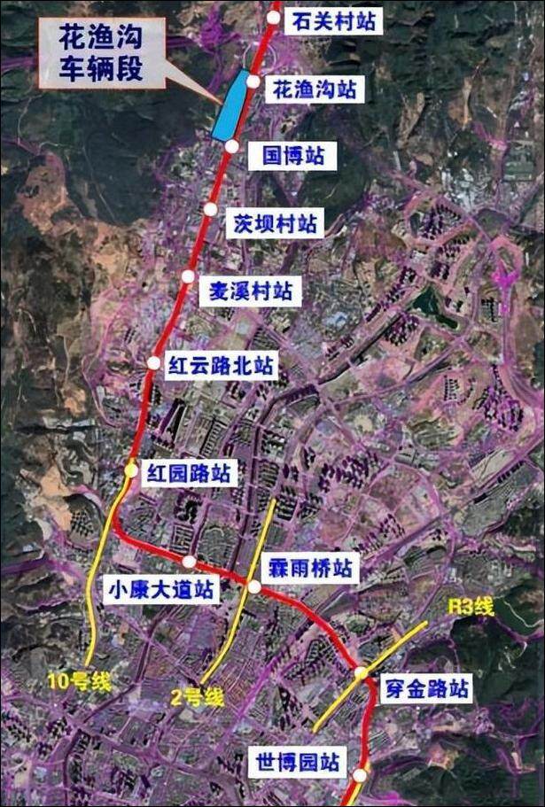 线路起讫点为石关村站~世博园站。全长13.8km,全地下敷设,设置车站11座,平均站间距1.38km。设车辆基地1座(花渔沟车辆段),2座主变电所(红园路、世博园)及相配套的车辆和机电设备。
