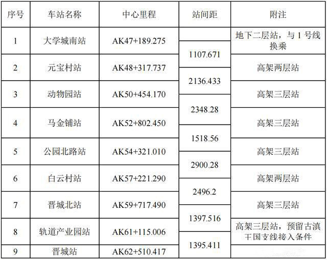 线路起讫点为大学城南站~晋城南站。全长18.2km,地下线约0.6km。全线共设车站10座(其中地下车站1座,高架车站9座),平均站间距2km。设车辆基地1座(晋城车辆段),1座主变电所(公园北路主所)及相配套的车辆和机电设备。