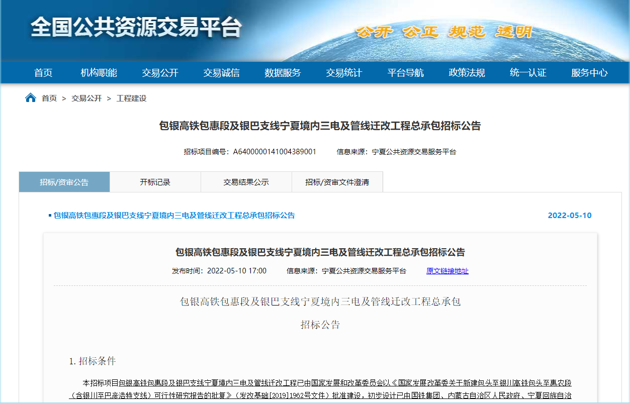 On May 10, 2022, the National Public Resource Exchange Center released the general contracting announcement for the general contracting of the Bao-Yin High-speed Railway Bao-Hui Section and the Yin-Ba Branch Line in Ningxia, the three power and pipeline relocation projects in Ningxia. The total investment in Ningxia is 4.998 billion yuan.