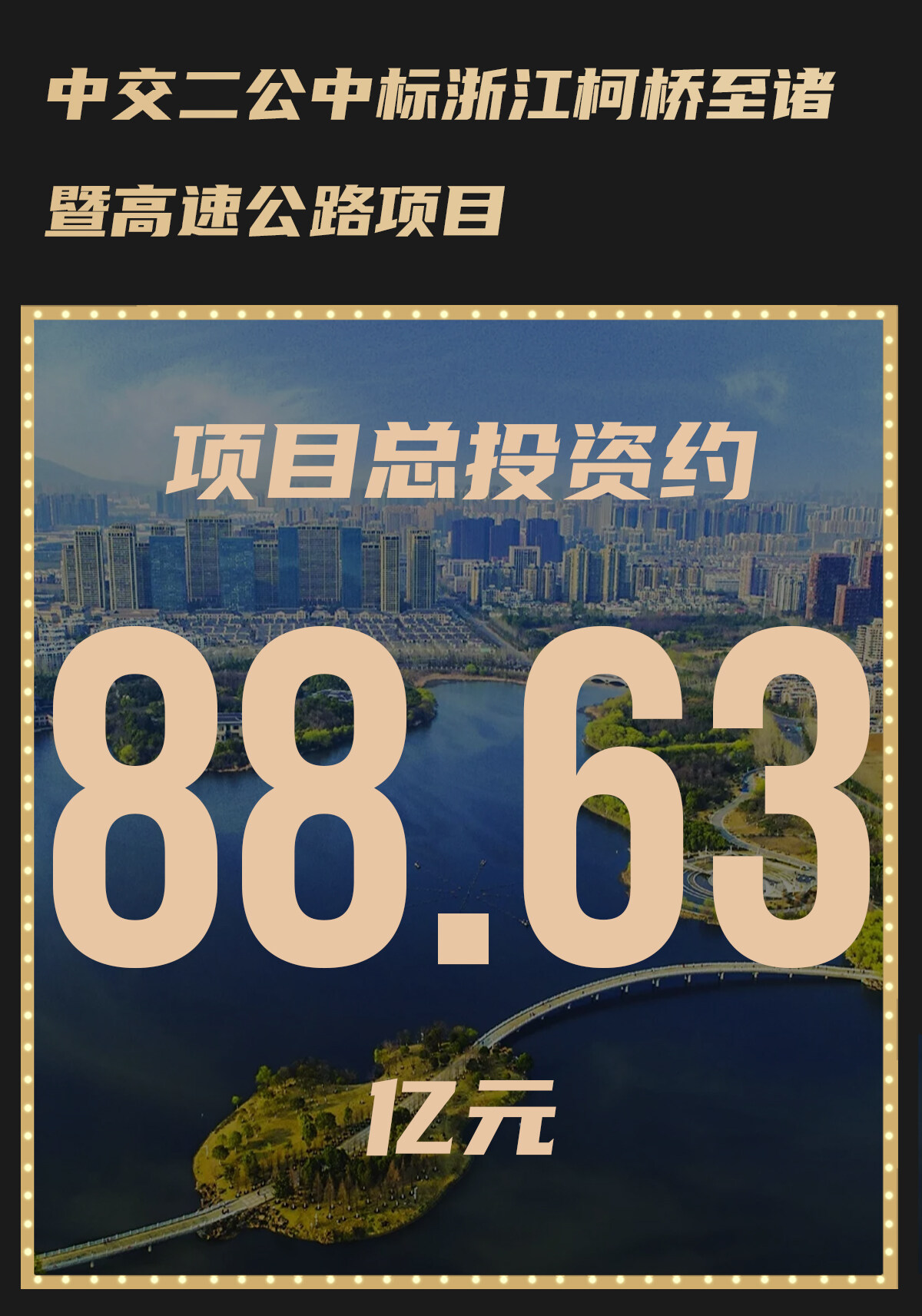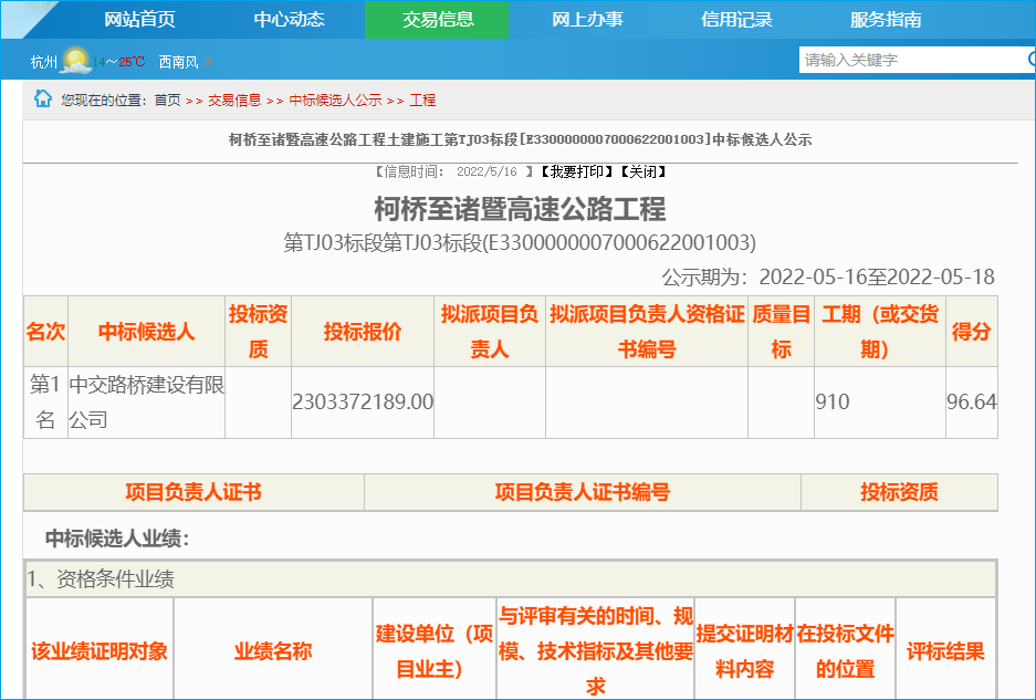 2022年5月16日,浙江省公共资源交易网发布柯桥至诸暨高速公路工程土建施工中标候选人公示,浙江交工集团股份有限公司、中交第二公路工程局有限公司等四家单位中标,项目总投资约88.63亿。