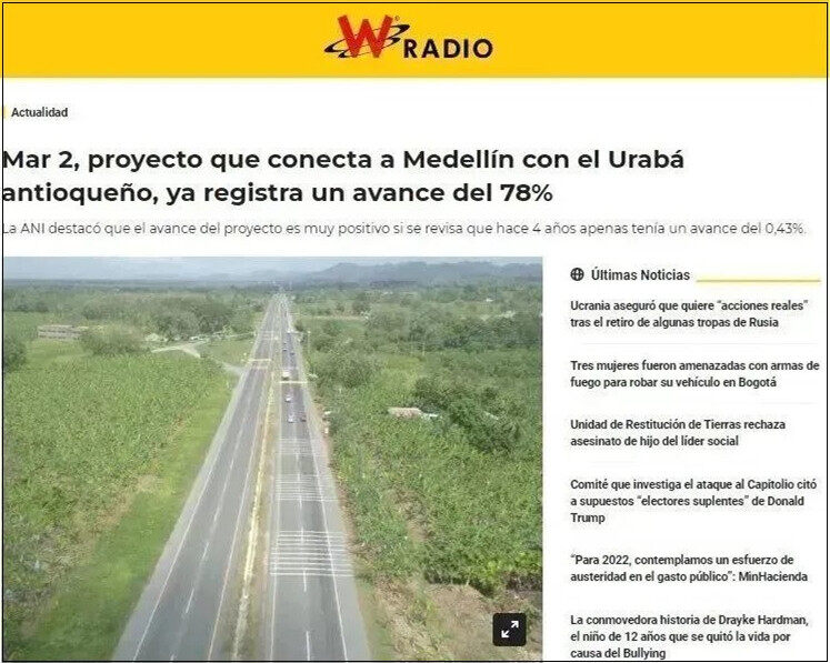 哥伦比亚国家基础设施局在其官网刊登了中国港湾承建的Mar2高速公路的进度报告,哥伦比亚广播电台、Hora13电视频道等多家媒体进行报道,高度评价中国港湾项目团队的专业能力,赞扬团队在项目中作出的杰出贡献,表示由衷的感谢,期待项目顺利竣工。