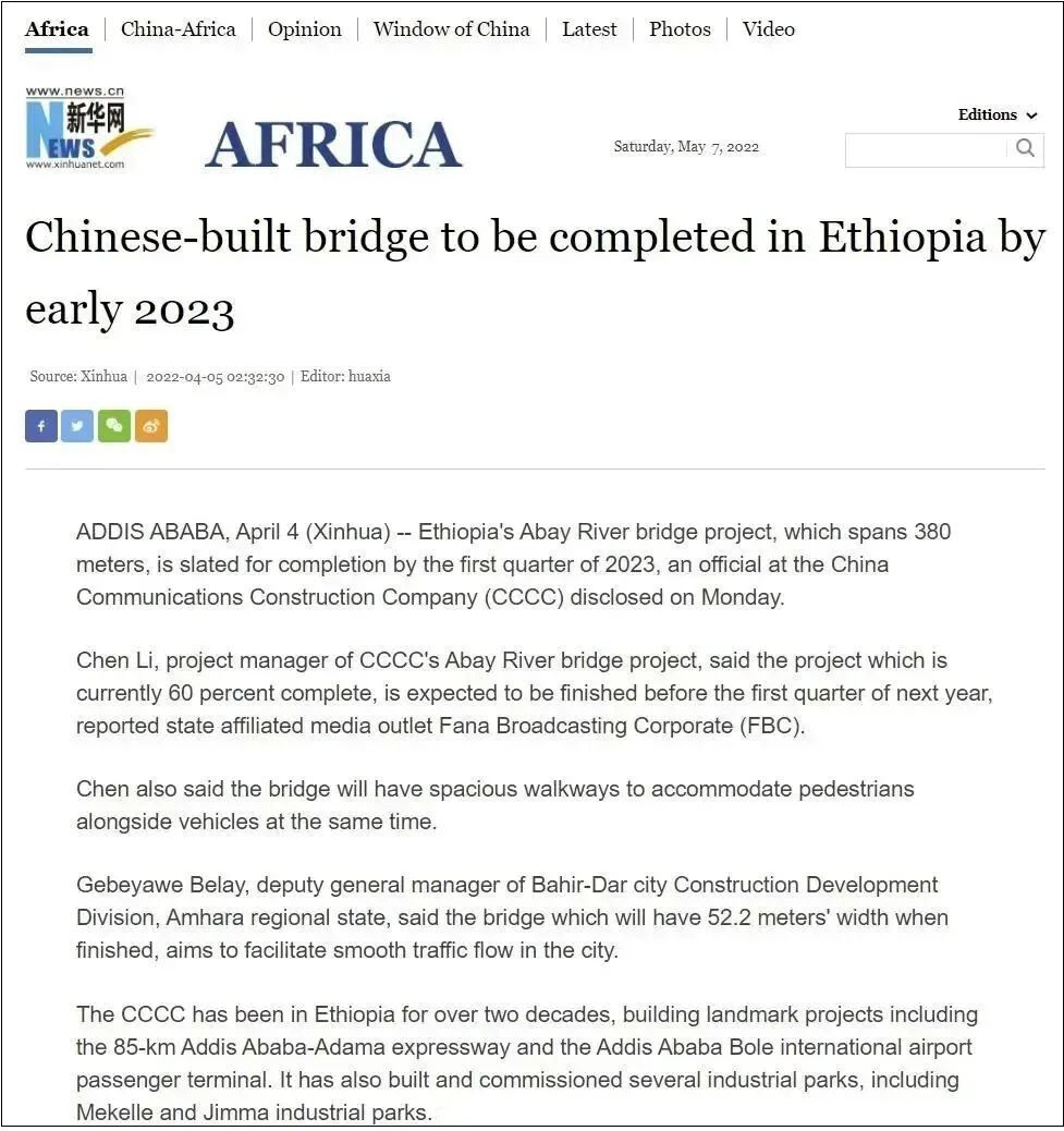 近日,埃塞俄比亚FBC广播电台等主流媒体对中国交建承建的埃塞巴哈达尔斜拉桥进行了报道。