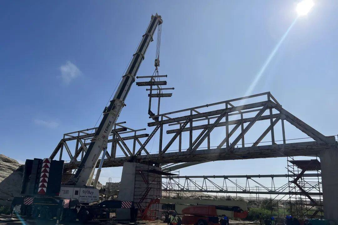 历经3天的昼夜奋战,5月13日下午17点,随着现场500吨重的起吊机将最后一跨钢桁梁精准落位,标志着Swakopmund桥钢结构拆除和吊装施工取得圆满成功,纳米比亚铁路修复项目顺利实现桥梁施工关键节点。
