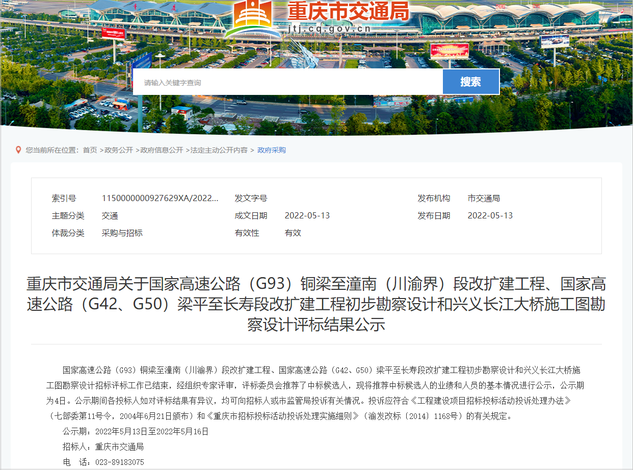 日前,重庆市交通局发布重庆市交通局关于国家高速公路G93铜梁至潼南段改扩建工程评标结果公示,项目由中交第一公路勘察设计研究院有限公司中标,估算总金额85.7亿元。
