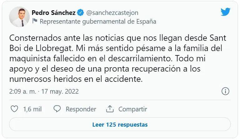 كما أعرب رئيس الوزراء الإسباني سانشيز عن تعازيه لأسرة السائق على وسائل التواصل الاجتماعي ، قائلاً: "لقد صدمت من المأساة التي وقعت في محطة سان بوديليو دي لوبريغات ، وأقدم تعازي الحارة للسائق المتوفى وأعبر عن دعمي للمصابين الكثيرين في الحادث ونأمل أن يتمكنوا من التعافي بسرعة. "المحرر / هي يوتينج