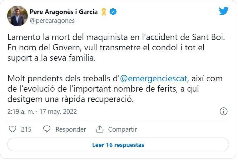 قال بيري أراغون ، رئيس منطقة كاتالونيا الإسبانية ، عبر وسائل التواصل الاجتماعي: "أعبر عن أسفي لوفاة السائق في الحادث الذي وقع في محطة سان بوديليو دي لوبريغات ، وبالنيابة عن الحكومة أود أن أنقل التعازي إلى أسرته. سنراقب عن كثب تطورات الحادث مع تعاطفنا وتعازيه ونتمنى الشفاء العاجل للمصابين ".