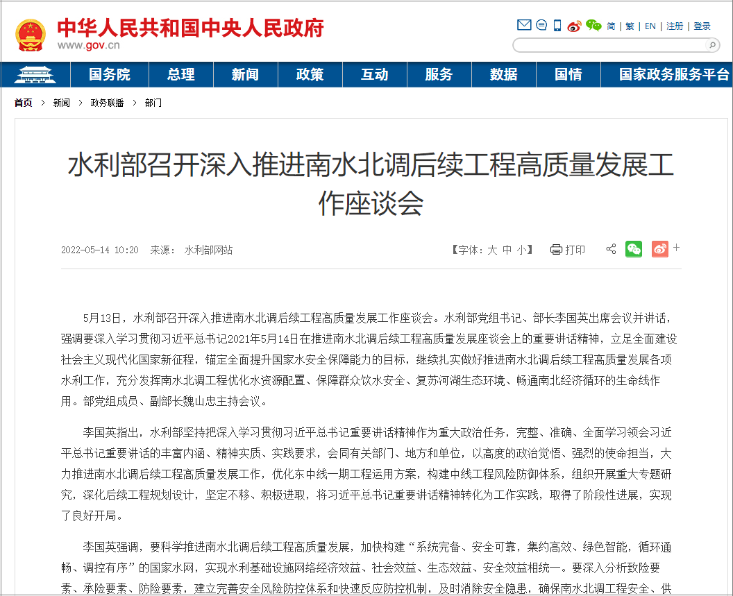 Recently, the Ministry of Water Resources held a symposium on in-depth promotion of the high-quality development of the follow-up project of the South-to-North Water Diversion Project. Li Guoying, Secretary of the Party Group and Minister of the Ministry of Water Resources, attended the meeting and delivered a speech.