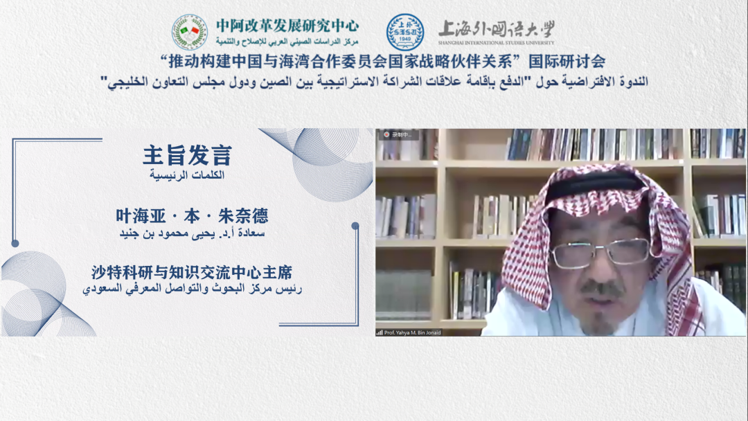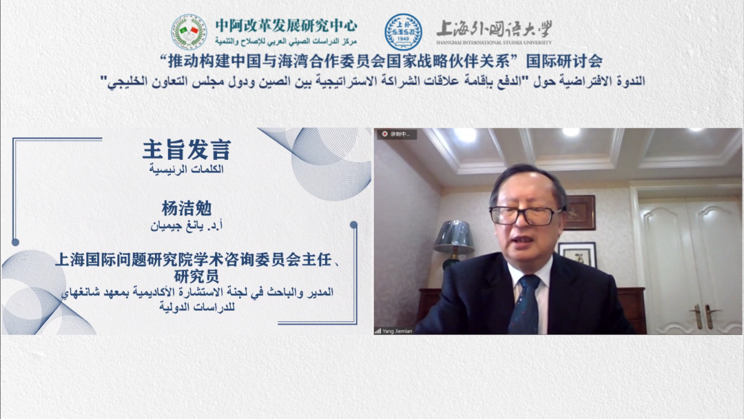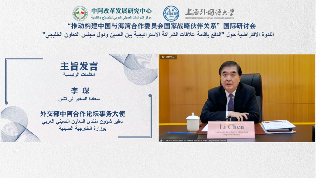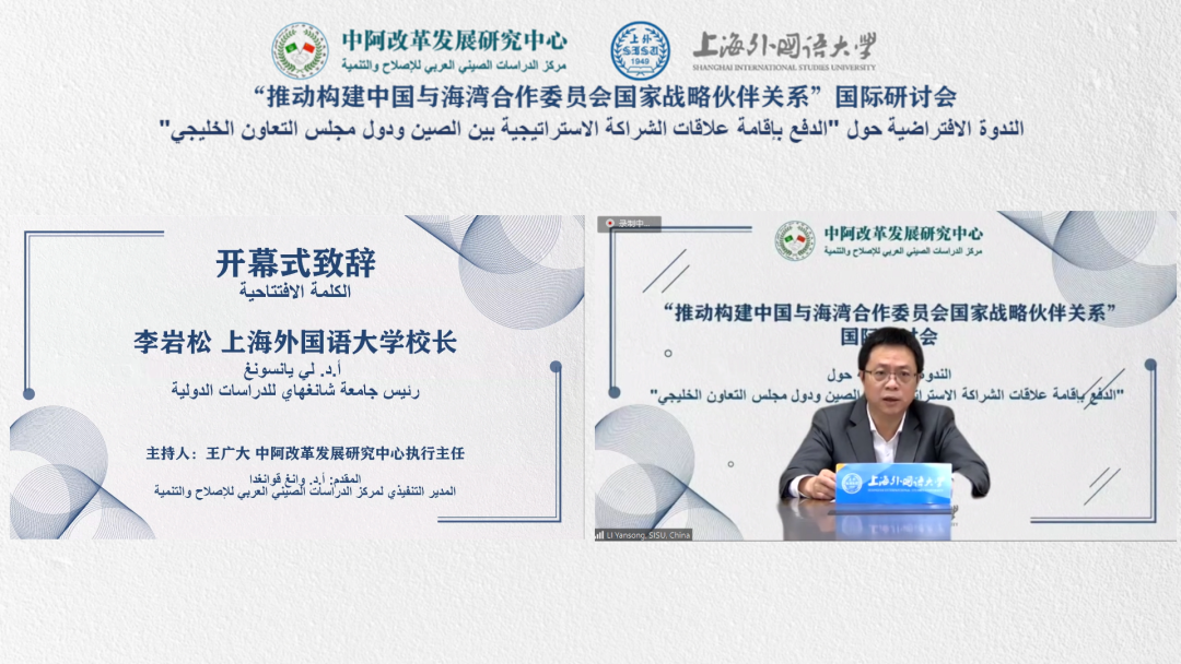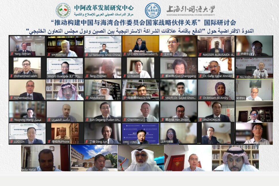 5月19日,中阿改革发展研究中心成功举办“推动构建中国与海湾合作委员会国家战略伙伴关系”线上国际研讨会,来自中国、沙特、阿联酋、科威特、卡塔尔、阿曼、巴林、苏丹、埃及、伊拉克等国的40余位大使、专家学者出席。上海外国语大学校长李岩松致开幕辞,外交部中阿合作论坛事务大使李琛,沙特科研与知识交流中心主席叶海亚·本·朱奈德,上海国际问题研究院学术咨询委员会主任杨洁勉作主旨发言。阿曼驻华大使纳赛尔·布赛义迪作为海合会国家驻华大使代表出席开幕式。