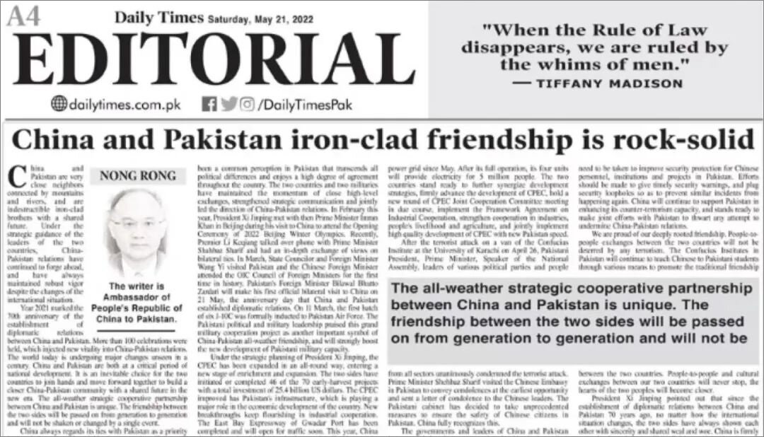 2022年5月21日,驻巴基斯坦大使农融在巴《每日时报》发表《中巴“铁杆”友谊坚如磐石》的署名文章,热烈祝贺中巴建交71周年。