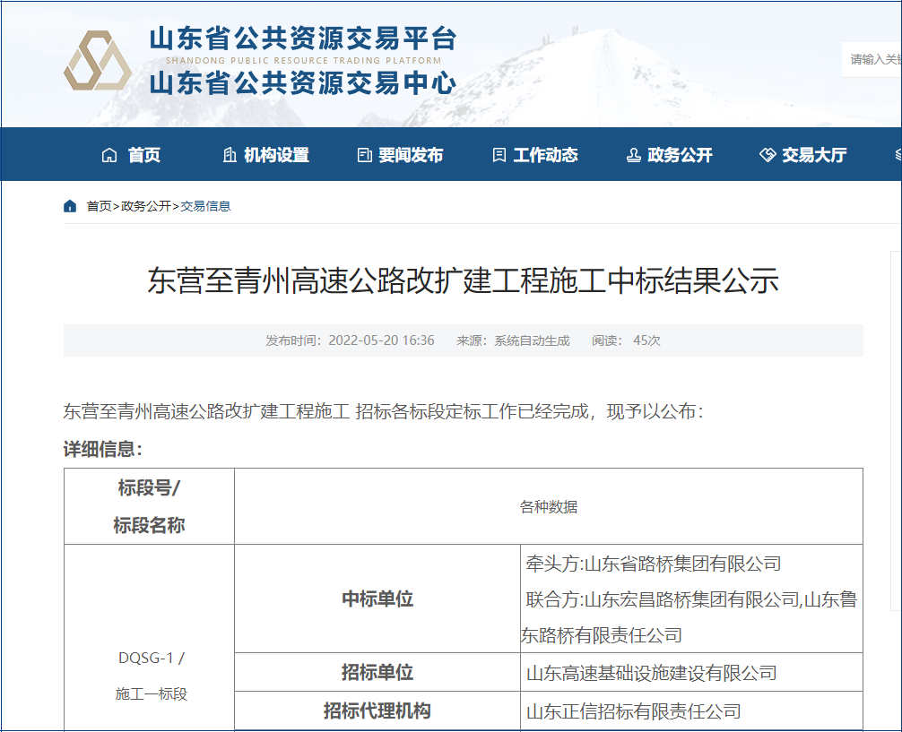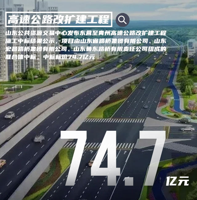 2022年5月20日,山东公共资源交易中心发布东营至青州高速公路改扩建工程施工中标结果公示,项目由山东省路桥集团有限公司、山东宏昌路桥集团有限公司、山东鲁东路桥有限责任公司组成的联合体中标,中标标价74.7亿元。