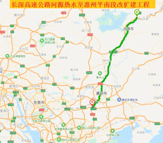 长春至深圳国家高速公路河源热水至惠州平南段改扩建工程地点位于广东省河源市、惠州市。里程长约116.612Km,分别由粤赣高速公路的河源热水至埔前段 36.5Km 与惠河高速公路的河源埔前至惠州平南段 80.112Km 组成。本项目改扩建起点位于河源市东源县仙塘镇,途经源城区、埔前镇、惠州市博罗县、惠城区、仲恺高新区,止于惠州市惠阳区镇隆镇平南枢纽互通,接长深高速惠州至盐田港段。