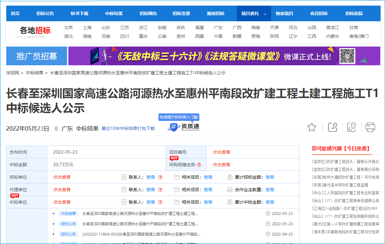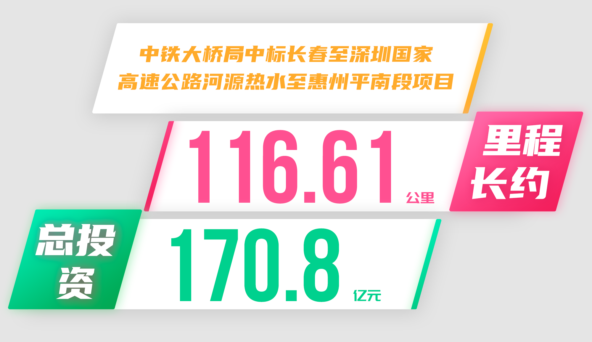 2022年5月3日,从全国公共资源交易平台了解到,长春至深圳国家高速公路河源热水至惠州平南段改扩建工程土建工程z中标候选人公示已公布,项目共分为9个标段,由中铁大桥局集团有限公司等8家单位中标,项目投资约170.8亿元。