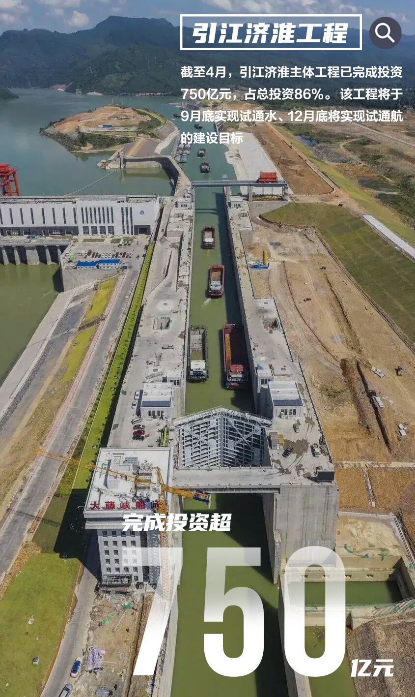 2022年以来,安徽建立“半月调度、月份督查、季度通报、年终考核”工作机制,全力推进引江济淮主体工程建设。截至4月,引江济淮主体工程已完成投资750亿元,占总投资86%。该工程将于9月底实现试通水、12月底将实现试通航的建设目标。