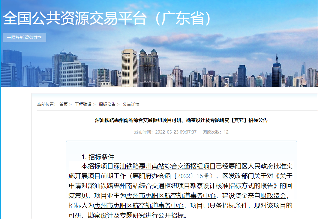 2022年5月23日全国公共资源交易平台发布深汕铁路惠州南站综合交通枢纽项目可研、勘察设计及专题研究招标公告,所属行业房建,招标人惠州市惠阳区航空轨道事务中心,项目总投资约65.3亿元。
