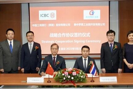 2022年5月23日,泰中罗勇工业园发展有限公司与中国工商银行(泰国)有限公司在曼谷签署战略合作协议,深化了双方的合作关系,进一步加强了双方在帮助中资企业在泰国投资和融资方面的协同作用。工银泰国总经理李晓波和泰中罗勇工业园总裁赵斌出席了签约仪式,并签署了战略合作协议。工银泰国副总经理唐永民、中国业务中心主任郭毅、工业园区分行行长王中华、工业园区副行长童博、行长助理岳群、投资促进部经理李秋出席了签约仪式。