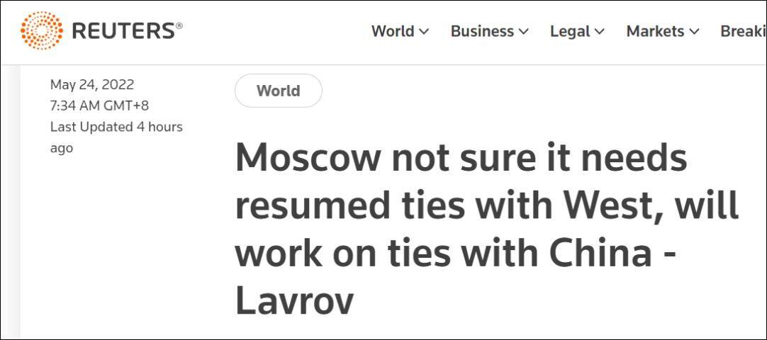 2022年5月23日,俄罗斯外长拉夫罗夫表示,俄罗斯正在努力摆脱对西方进口的依赖,未来只会依赖“可靠”的国家。在谈到中国时,他说,俄罗斯当前的目标是进一步发展同中国的关系。拉夫罗夫还表示,如果西方国家希望恢复与俄罗斯的关系,俄罗斯将考虑是否有必要。