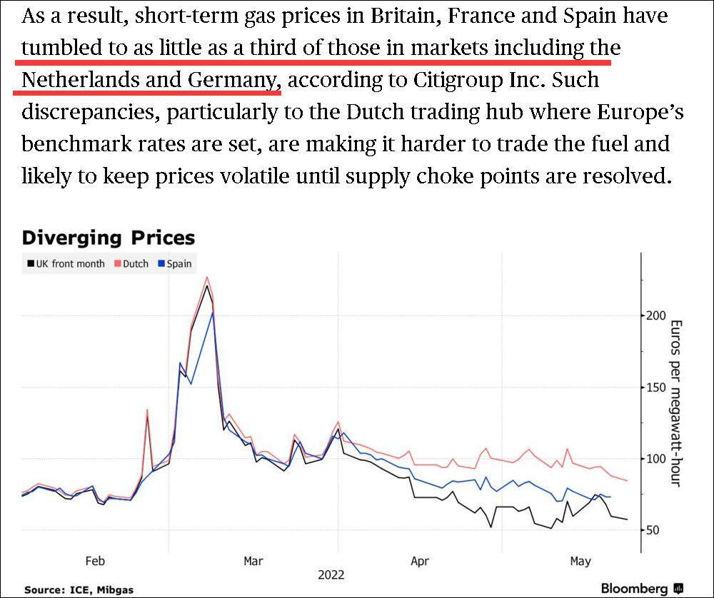 结果,天然气的价格便在欧洲内部出现了两极分化的情况。诸如英国这样的西欧国家,其短期的天然气价格在经历了2月底和3月初俄乌冲突刚爆发时的暴涨后,如今已经大幅下跌,东欧短期的天然气价格虽然也有所回落,却因为液化天然气的运输问题,令其价格比西欧高出数倍——就连荷兰和德国的天然气价格,都明显高于英国、法国和西班牙的价格。