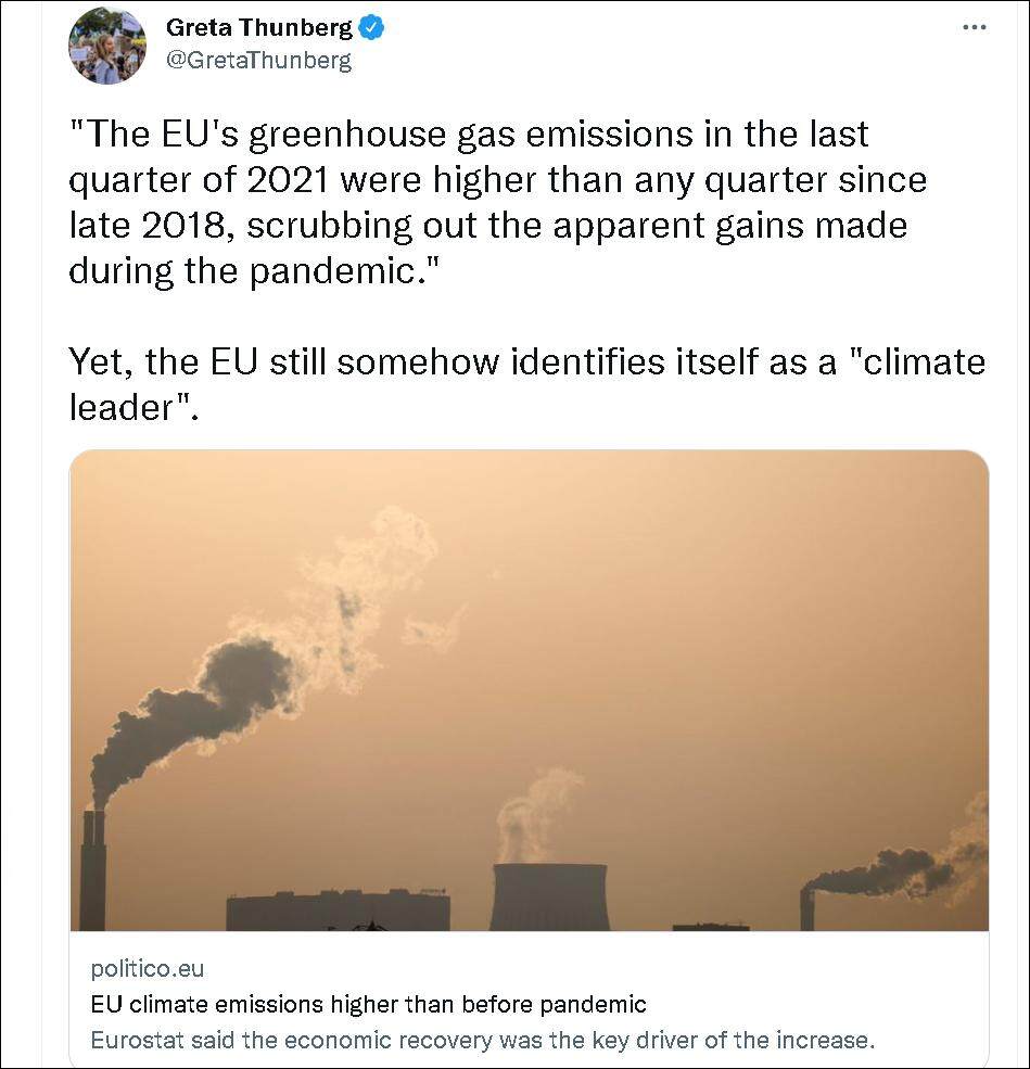 上周,美国Politico网站发现,欧洲在2021年第四季度的温室气体排放量,已经超过了自2018年以来任何一个季度的排放量,说明欧洲在节能减排上是不进反退的。瑞典的“环保少女”格蕾塔·桑伯格(Greta Thunberg)当时也吐槽了此事,质问欧洲怎么好意思说自己是“节能减排的领导者”?