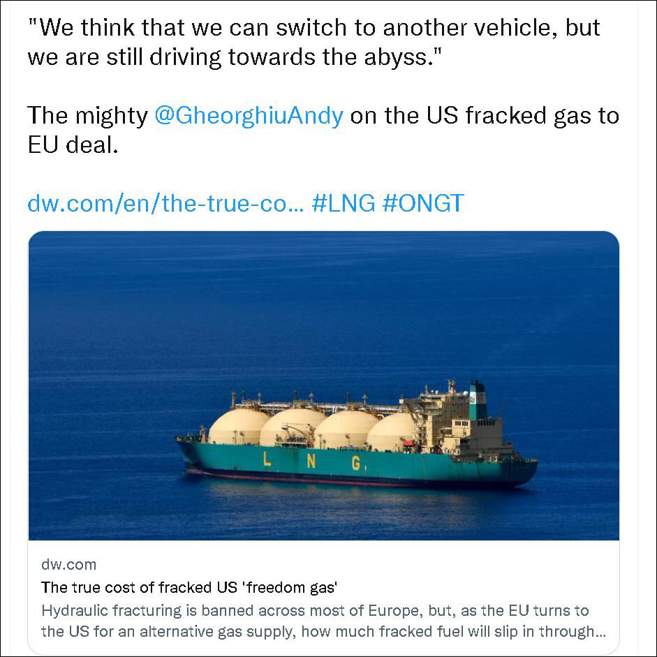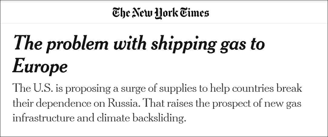 而在2022年3月美国总统拜登和欧盟委员会主席冯德莱恩签署了美国给欧洲增加天然气供应的协议后,一位德国的环保主义者在接受“德国之声”采访时更是相当形象地比喻说: