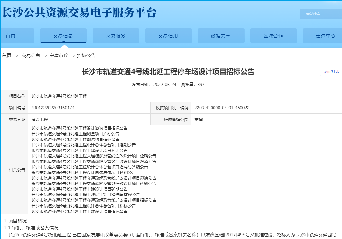 On May 24, 2022, the Changsha Public Resource Trading Electronic Service Platform released the bidding announcement for the North Extension Project of Changsha Rail Transit Line 4. The industry rail transit, the tenderer, Changsha Rail Transit Line 4 Construction and Development Co., Ltd., the project The total investment is about 10.252 billion yuan.