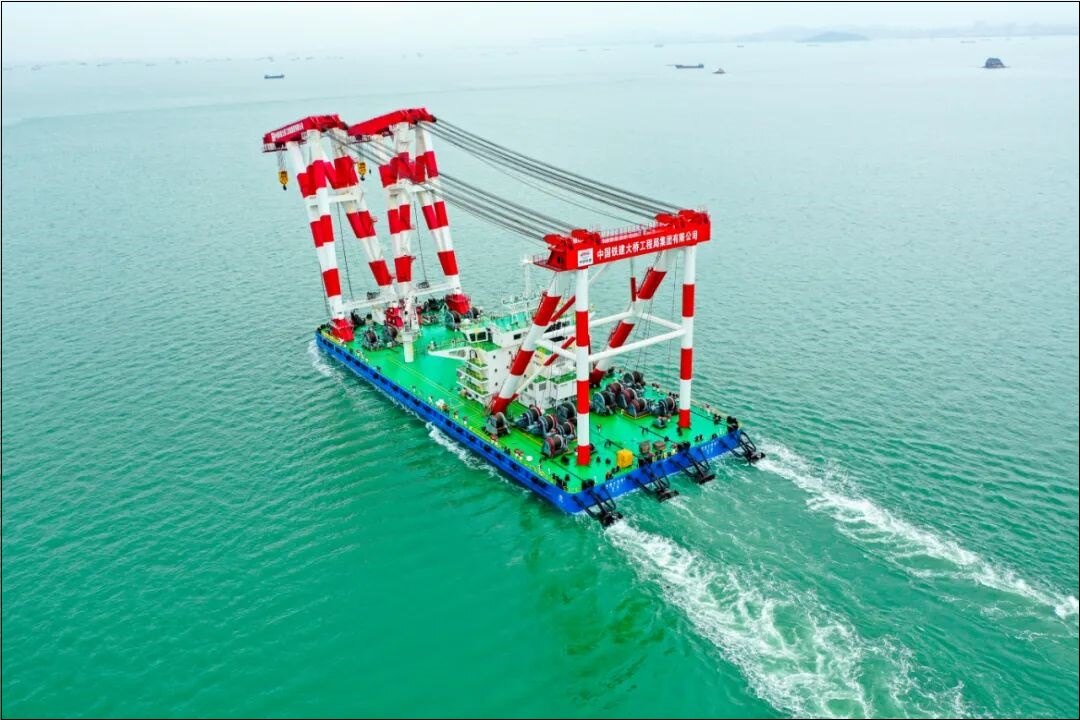 2022年5月27日上午,为澳门第四跨海大桥量身打造的2200吨铁建大桥起1号起重船开始执行海上首片钢梁吊装任务,该项目海上钢结构施工全面展开,项目建设将进一步提速升级。