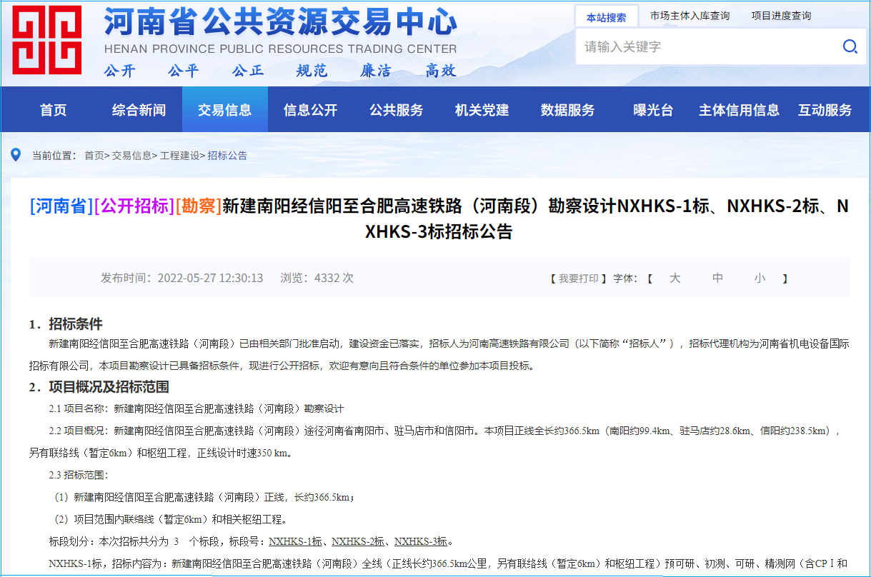 NXHKS-2标:招标内容为信阳市境内息县以西,正线长度约131.3km,所有站前工程、站后四电、站房及相关工程等勘察设计工作。