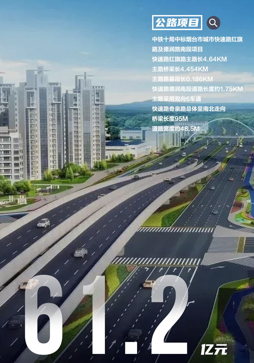 2022年5月30日,从烟台市公共资源交易中心了解到烟台市城市快速路红旗路及德润路南段(港城西大街互通立交-通林路)建设工程预中标-中标公告,项目由中铁十局集团有限公司、中铁建工集团有限公司、中铁资本有限公司预中标,项目总投资61.2亿元。