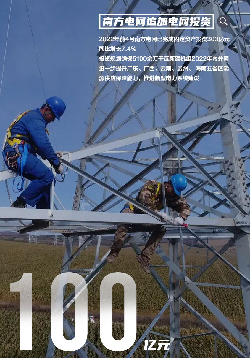 南方电网有限公司坚决贯彻党中央、国务院决策部署,通过新安排100亿元电网固定资产投资,多措并举帮助中小企业排忧解难,充分发挥电网企业助力实体经济高质量发展的战略支撑作用,全力服务“六稳”“六保”大局,为稳定宏观经济大盘提供有力支撑。据介绍,2022年,南方电网固定资产计划投资1250亿元,超出往年两成,2022年前4月已完成固定资产投资303亿元,同比增长7.4%。