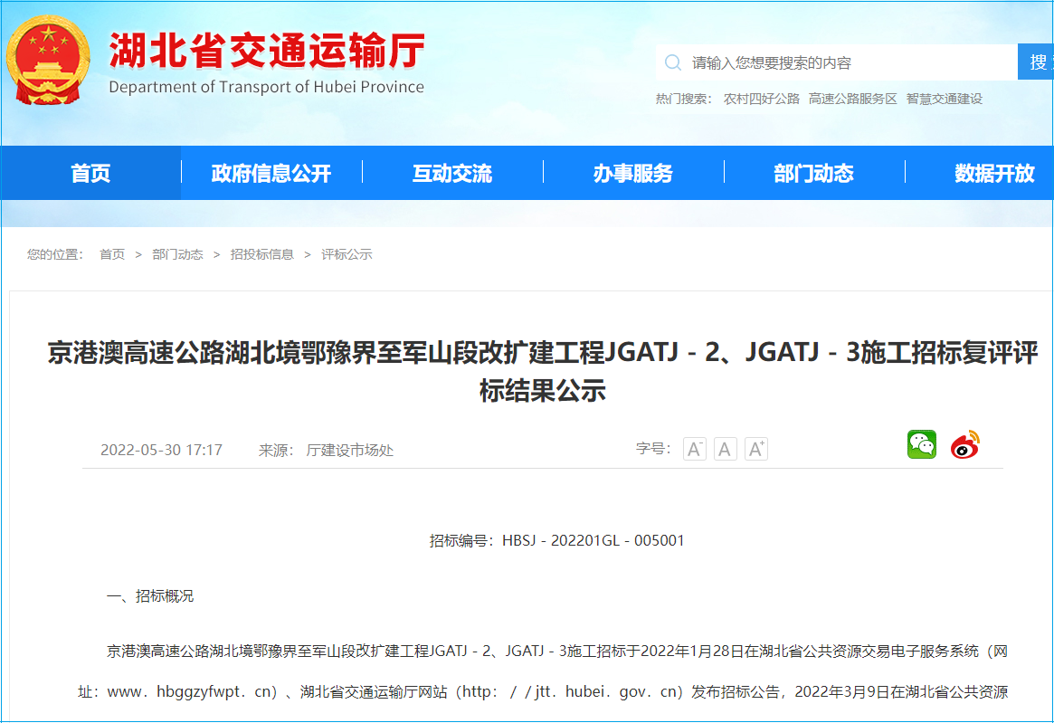 On May 30, 2022, the Hubei Provincial Department of Transportation released the results of the re-evaluation and evaluation of the construction bidding for the JGATJ-2 and JGATJ-3 reconstruction and expansion projects of the Hubei-Henan-Junshan section of the Beijing-Hong Kong-Macao Expressway. According to the bid evaluation report submitted by the bid evaluation committee, this has been the third time to change the first bid winner for the JGATJ-2 and JGATJ-3 bid sections of the Beijing-Hong Kong-Macao Expressway Hubei-Henan-Junshan section reconstruction and expansion project.