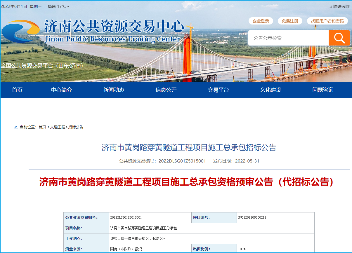 2022年5月31日,全国公共资源交易平台发布济南市黄岗路穿黄隧道工程项目施工总承包招标公告,所属行业市政,招标人济南城港建设工程有限公司,项目总投资65.46亿元。
