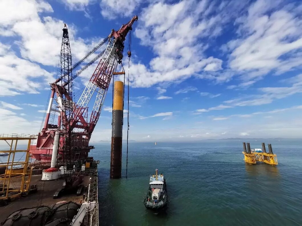 冬季季风带来的巨大浪涌,对在洋上施工的风电站项目来说简直是场梦魇。在珠海无遮蔽施工海域正在建设风电机组的施工人员正遇到这样的糟糕天气,寒风导致的海面涌大浪急一直持续,在这种恶劣的气候环境下,根本无法把一根根巨大的钢管桩准确无误地插入海底,而这让珠海金湾海上风电项目团队的建设者们几乎快较劲了脑汁。