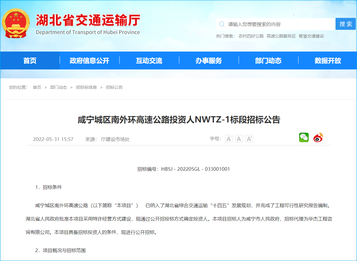 2022年5月31日,湖北省交通运输厅发布咸宁城区南外环高速公路投资人NWTZ-1标段招标公告,所属行业公路,招标人咸宁市人民政府,项目总投资约41亿元。