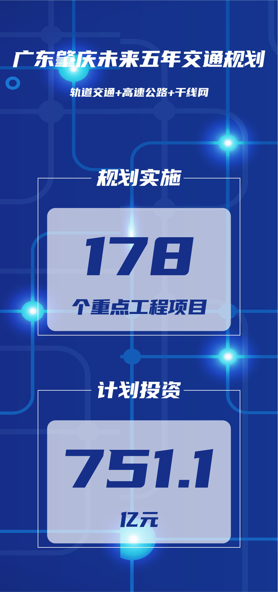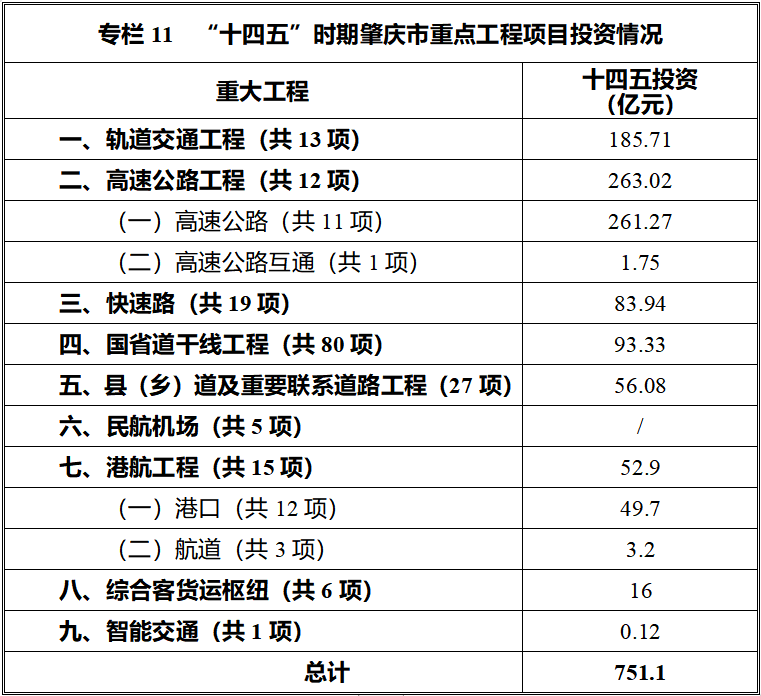 2022年6月2日,肇庆市人民政府发布《肇庆市综合交通运输体系发展“十四五”规划》。文件显示,“十四五”时期(2021-2025年),肇庆交通运输体系发展计划投资751.1亿,规划实施178个重点工程项目,涵盖机场、高铁、城轨、高速、航港、交通枢纽等建设。
