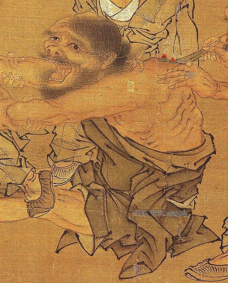 画面中央是被灸的病者,他的眉头紧锁,双目圆睁,肌肉紧绷,髭须根根竖立,衣裳散乱地围在下身;
