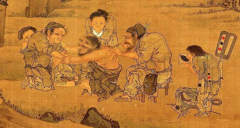 病者对面一位老妇人将其胳膊紧紧地钳制,还配合郎中按住患者的手脚,使他不能动弹;她身后一个只露出半个脑袋的人,面露同情之色;