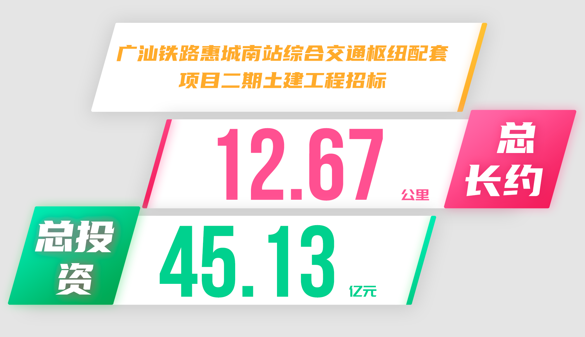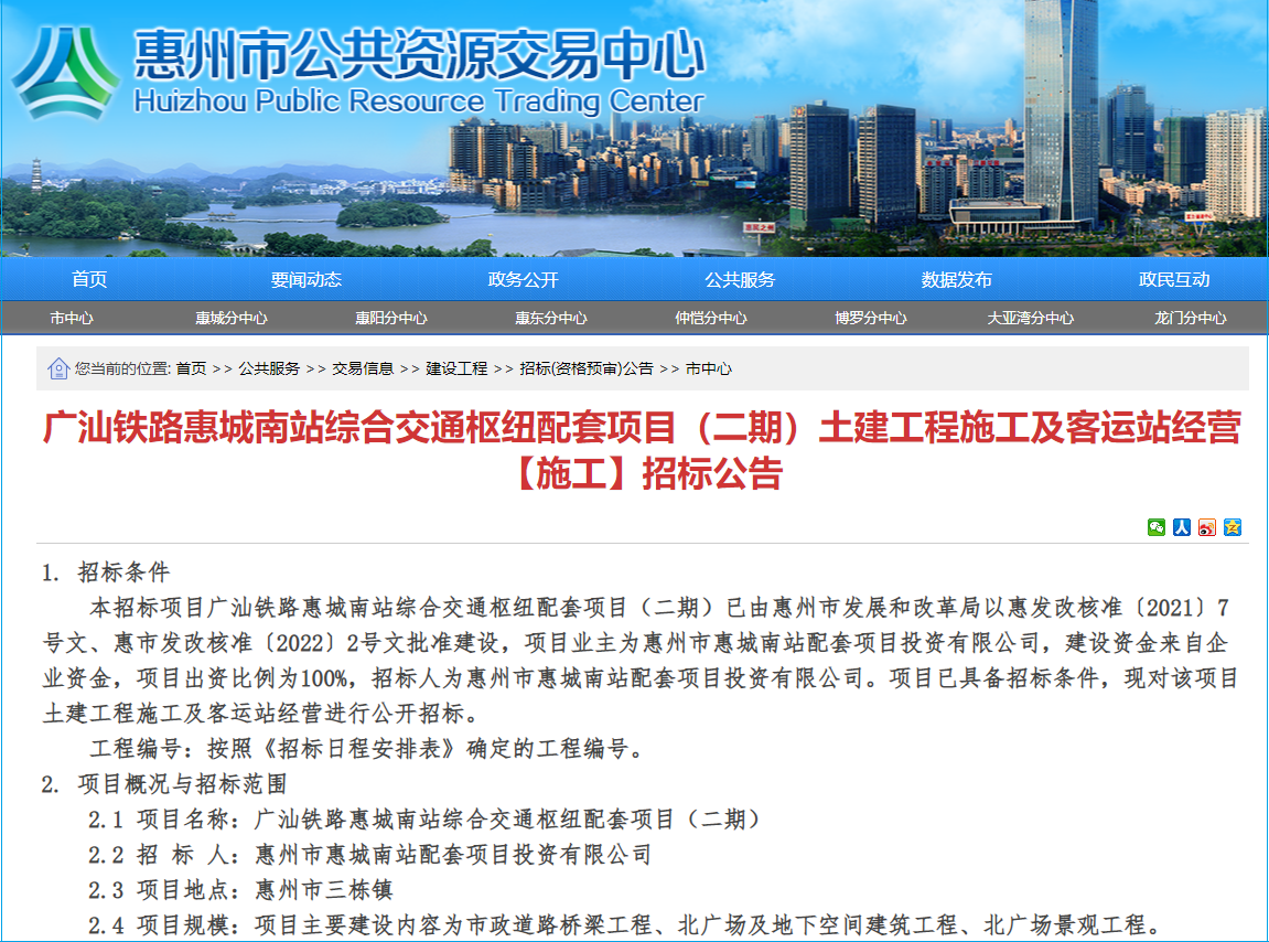 2022年6月7日,惠州市公共资源交易中心发布广汕铁路惠城南站综合交通枢纽配套项目二期土建工程施工及客运站经营施工招标公告,所属行业铁路,招标人惠州市惠城南站配套项目投资有限公司,项目总投资约45.13亿元。