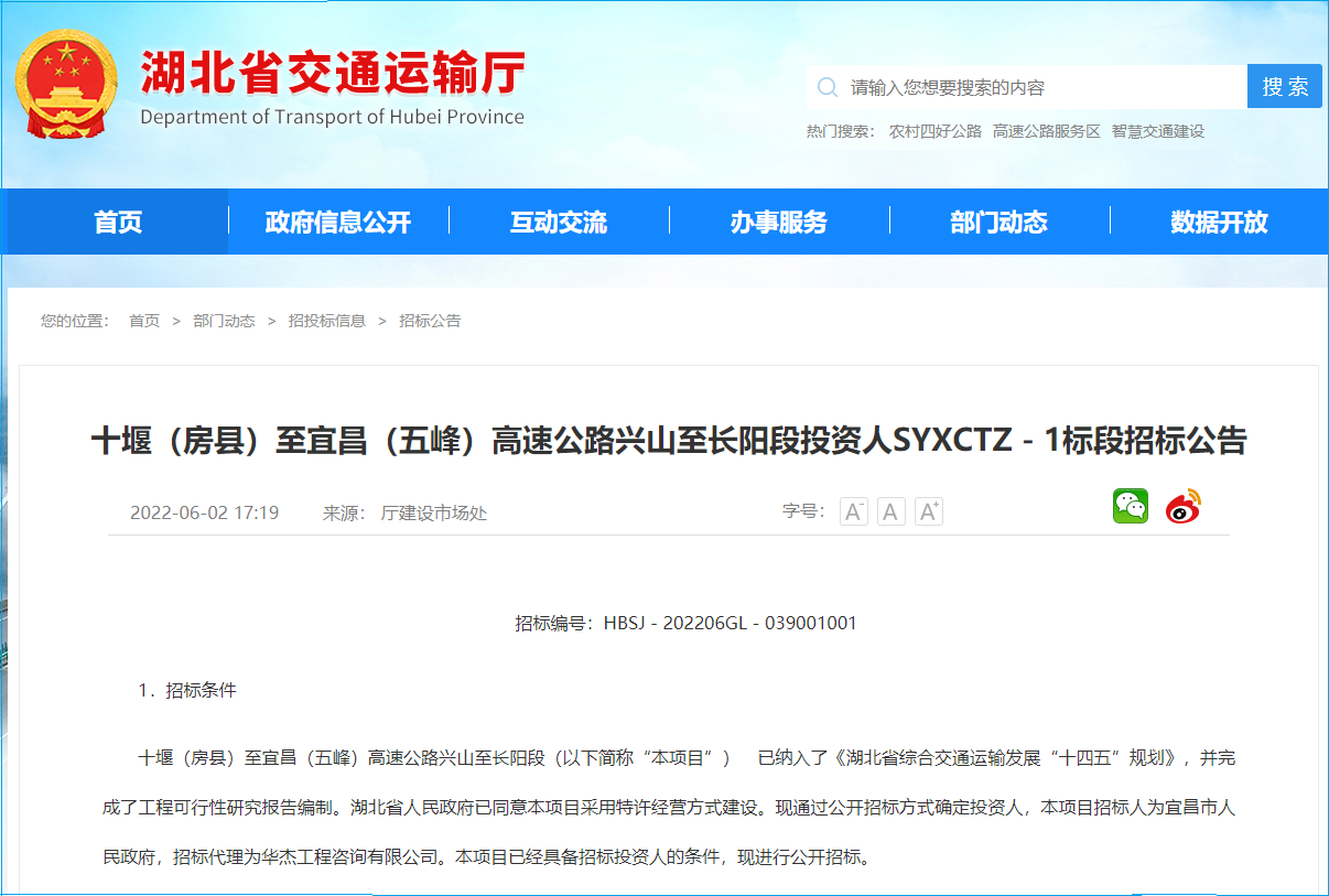 2022年6月3日,从湖北省交通运输厅了解到十堰房县至宜昌五峰高速公路兴山至长阳段投资人SYXCTZ-1标段正在招标,所属行业公路,招标人宜昌市人民政府,项目投资总额约为197.75亿元。