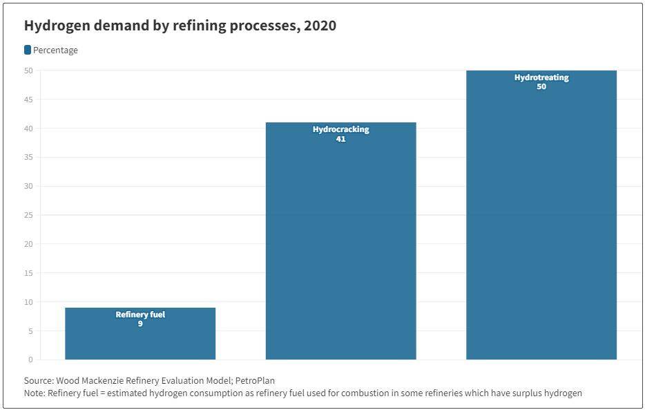 加氢处理和加氢裂化工艺分别用于降低成品中的硫含量和提高运输燃料的产量,是炼油行业消耗90%以上氢气的主要工艺。然而,炼油过程中超过65%的氢气需求是由催化重整装置和乙烯裂解装置的副产品提供的氢气满足的,而这种氢气不太可能被低碳氢气取代。