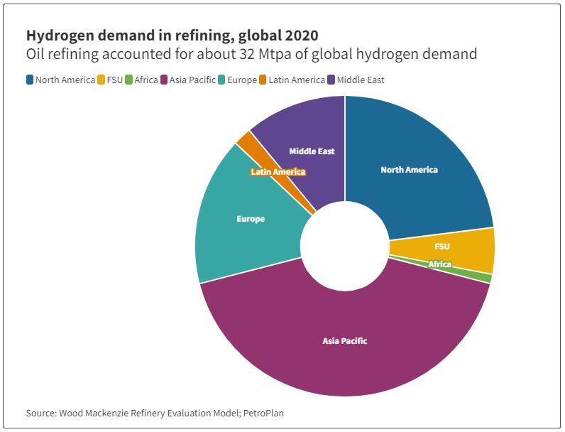 Wood Mackenzie表示,在绿色转型的努力下,到2050年,炼油行业对低碳氢的需求可能达到每年5000万吨(Mtpa)。绿色氢是由可再生资源产生的,而天然气则产生蓝色和灰色的氢。灰色氢的过程与蓝色相似,但没有捕获二氧化碳,而粉红色的氢是通过核能电解产生的。炼油是最大的氢市场之一,约占32Mtpa,即2020年全球氢需求的30%至35%。