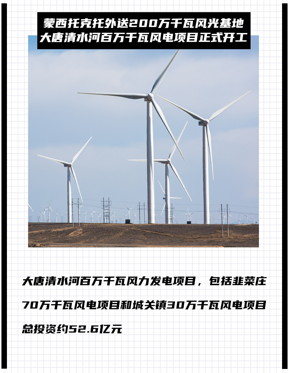 据了解,蒙西托克托外送200万千瓦风光基地大唐清水河百万千瓦风电项目成功纳入国家第一批以沙漠、戈壁、荒漠地区为重点的大型风电光伏基地建设项目清单。其中,大唐清水河百万千瓦风力发电项目由韭菜庄70万千瓦风电项目、城关镇30万千瓦风电项目组成,由大唐托克托发电公司的全资子公司-大唐清水河新能源有限公司负责建设和运营,总投资约52.6亿元,计划2022年投资39亿元,2023年完成全部投资。
