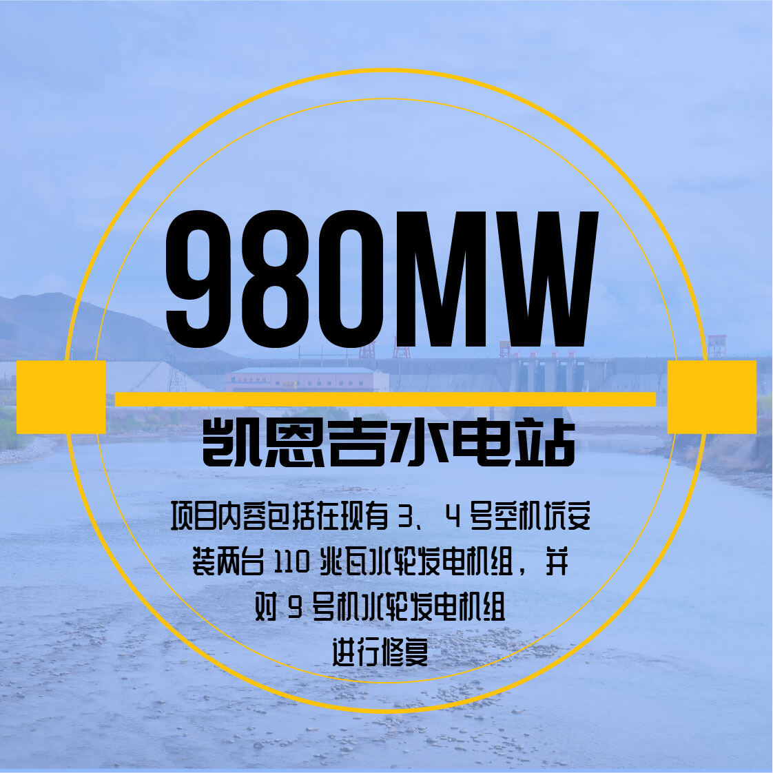 凯恩吉水电站是尼日利亚最大的水电工程,位于尼日尔河流域,现有总装机容量760兆瓦。项目内容包括在现有3、4号空机坑安装两台110兆瓦水轮发电机组,并对9号机水轮发电机组进行修复。项目建成后,电站装机容量将达到980兆瓦。
