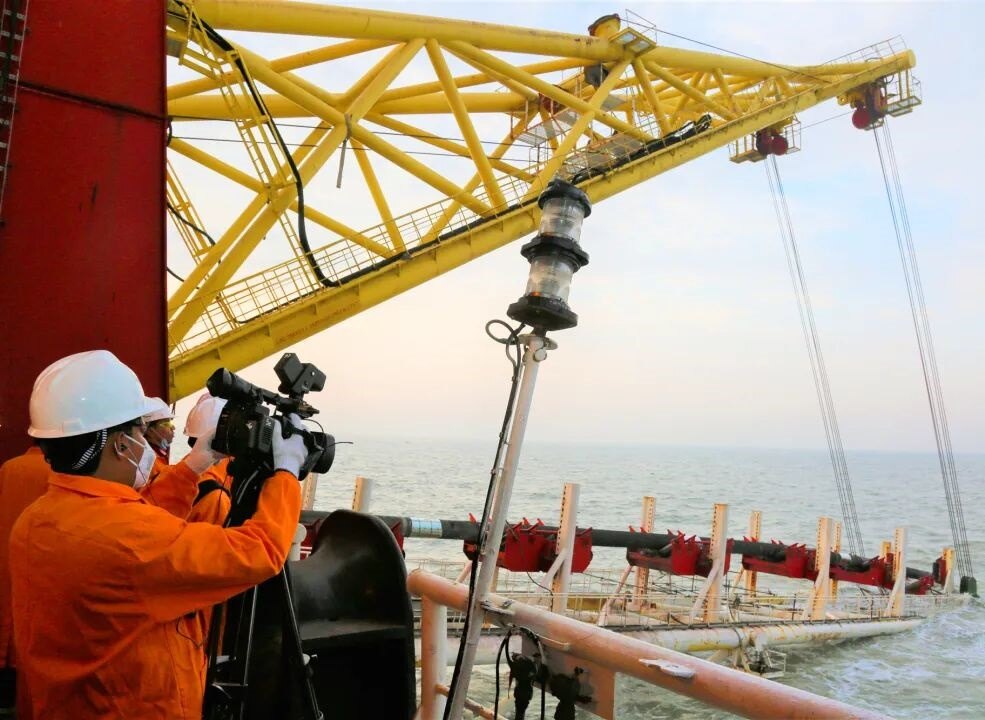 中国石油管道局工程有限公司孟加拉项目经理孙碧君:我们对挖沟机设备进行自主创新改造,实现最大后挖沟深度达11.9米;攻克了海上单点系泊装置水下毫米级对接技术;首次采用了独创的海上扩孔及拖管工艺,一次性穿越成功率100%。